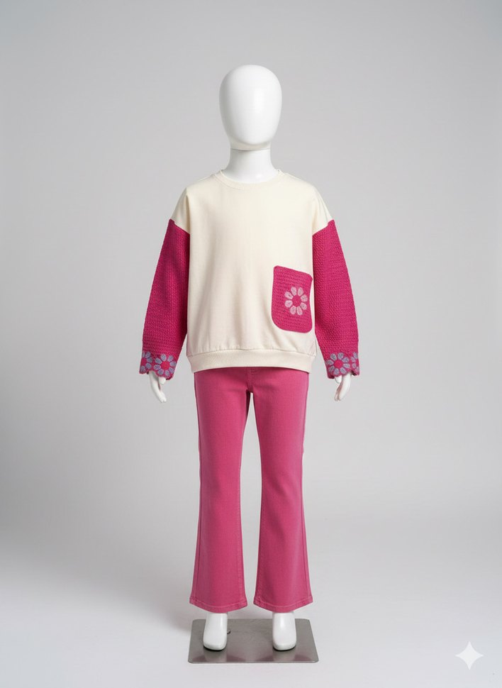 Kız çocukları için pembe salaş sweatshirt ve pantolon takımı, uzun kollu, bisiklet yaka ve örme detaylara sahiptir. Sweatshirtte tie-dye desenli kollar ve çiçekli cep bulunur. Yumuşak ve sıcak kumaştan üretilmiştir.