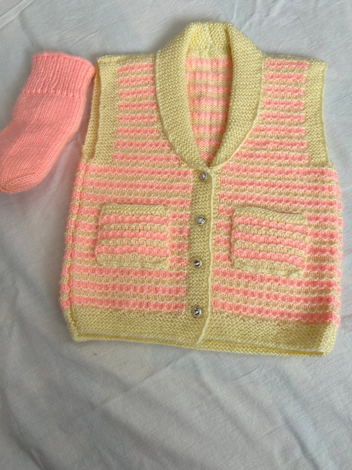 Kız çocuk için pastel pembe ve sarı renklerde, düğmeli, cepli, örgü süveter. Kolsuz ve bol kesimdir.