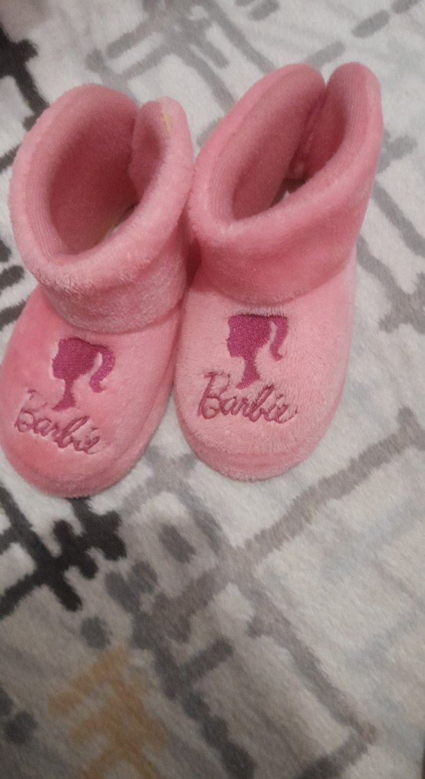 Pembe renkli, tüylü detaylı Barbie nakışlı kız çocuk ev botu