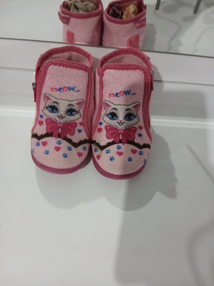 Yumuşak ve sıcak kumaştan yapılmış, pembe renkli, baskılı kedi desenli kız çocuk terlikleri. Kolay kullanımlı cırt cırtlı kapanışa sahiptir.