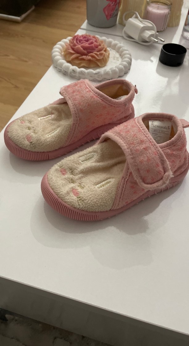 Kız çocuklar için pembe, yumuşak ve sıcak kürk terlikler, cırt cırtlı bantlı, pastel tonlarda ve sade tasarımlı.