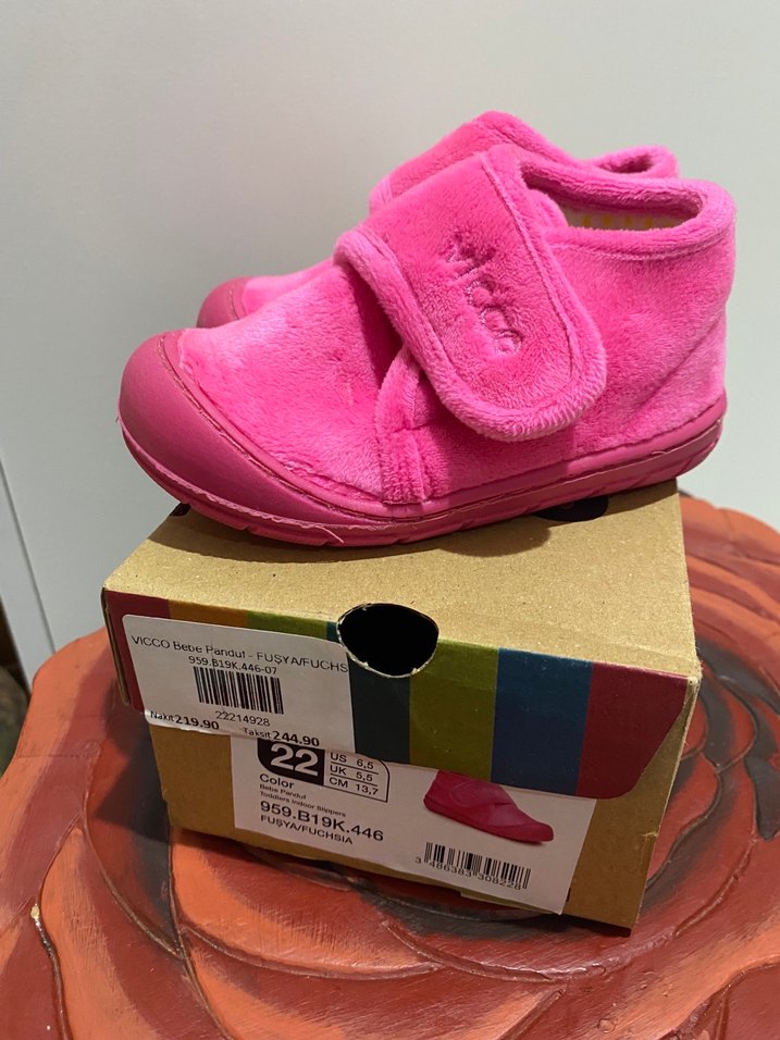 Pembe kız çocuk pandufu, yumuşak ve sıcak kumaştan üretilmiş, kolay giyilebilmesi için Velcro bantlı. Desensiz ve renkli tasarımıyla dikkat çekiyor.