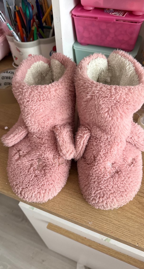 Pastel pembe renkli kız çocuk peluş terlikler, yumuşak ve sıcak kumaş ile kürk detaylıdır, iç mekanda rahatlık sağlar. Düz ve sade tasarıma sahiptir.