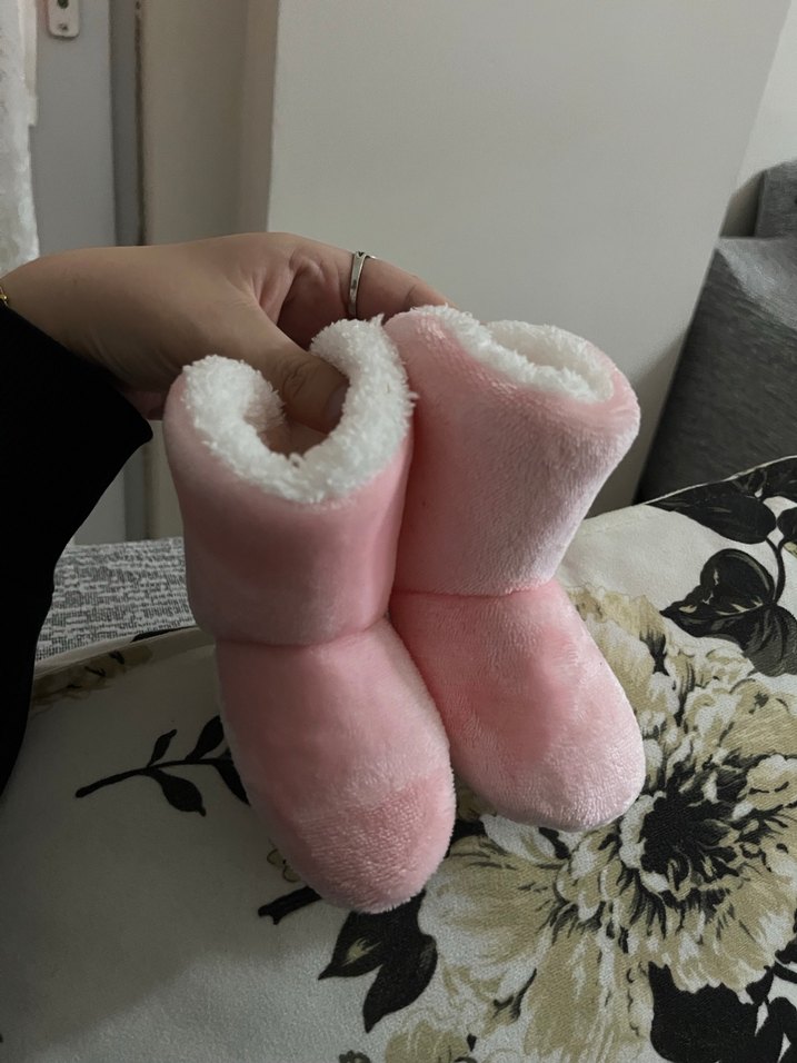 Kız çocukları için pembe, yumuşak ve kürk detaylı iç yüzeye sahip sıcak terlikler. Düz ve pastel tasarımı sade bir tarz sunar.