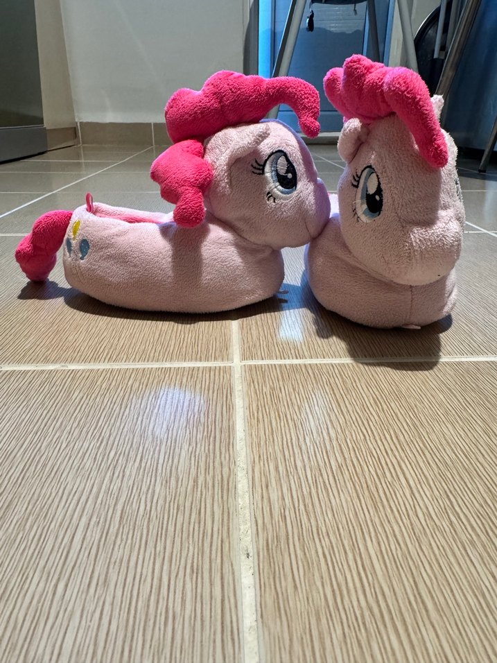 Kız çocukları için yumuşak peluş kumaştan yapılmış, renkli baskılı pop kültür desenli ve cırt cırtlı rahat terlikler.