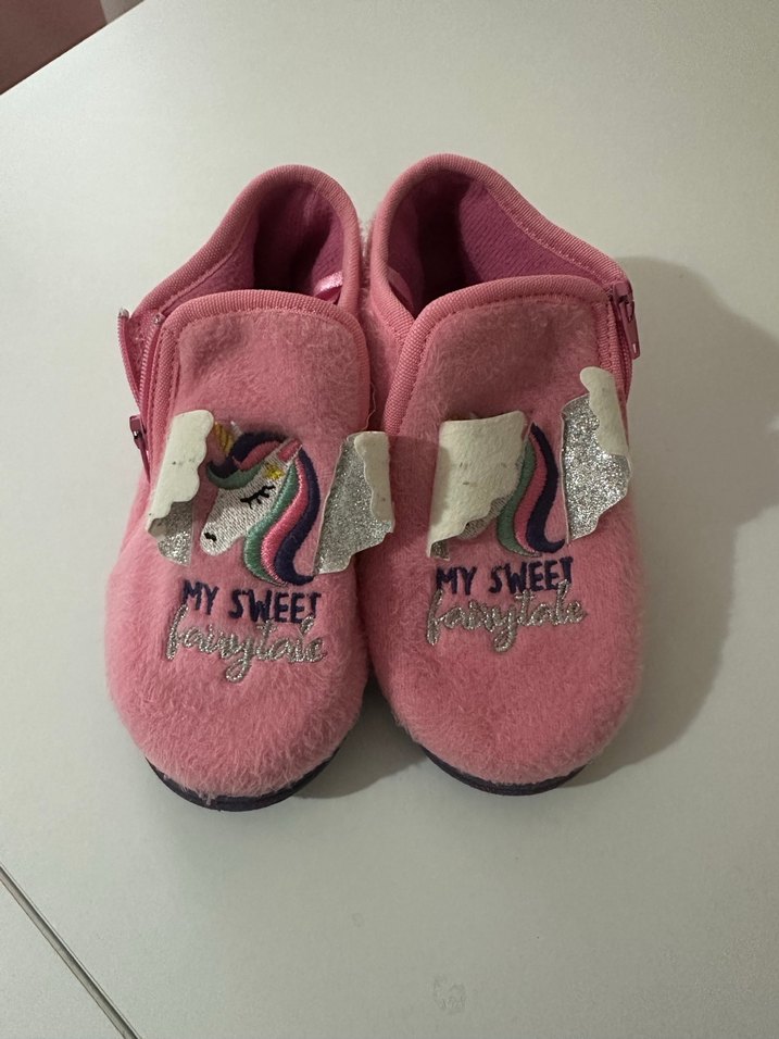 Pembe kız çocuk terlikleri, renkli nakışlı unicorn desenleri ve kolay giyilen velcro kapanışı ile yumuşak ve sıcak fleece kumaştan üretilmiştir.