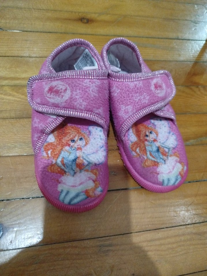 Kız çocuklar için renkli baskılı, pembe yumuşak kumaştan ve cırt cırtlı sokak stili terlikler.