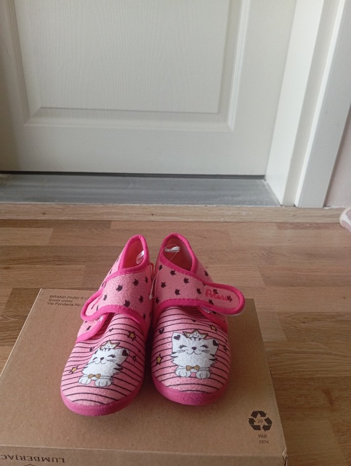 Kız çocukları için tokalı pembe sıcak terlikler, sevimli kedi baskılı ve rahat tasarımlı. 29 numara