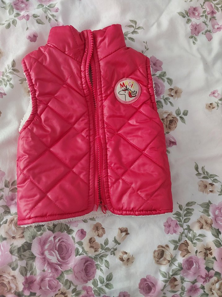 Renkli pembe, kolsuz, yakalı ve nakış detaylı kız çocuk yeleği. Yumuşak kürk detaylı, sıcak tutan kumaştan, trend sokak stili için uygun.
