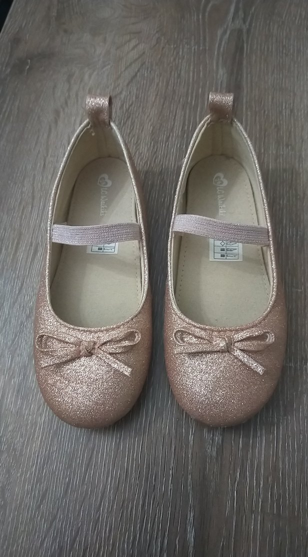 Kız çocukları için bej renkli, fiyonk detaylı ve yumuşak bantlı babet. Desensiz, hafif simli ve kauçuk tabanlıdır.