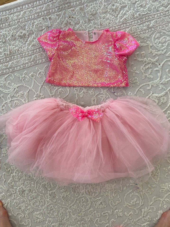 Kısa kollu, simli ve payetli üst kısmı ile pembe, kız çocuk elbisesi. kabarık etek ve süslü fiyonk. 1 kez yıl sonu gösterisinde giydik. 3-4 yaş.