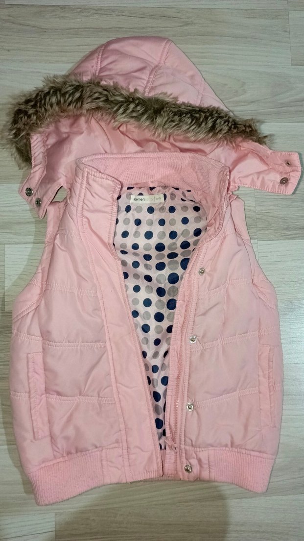 Pembe renkli, suni kürklü ve çıkarılabilir kapüşonlu kız çocuk yeleği. Hem fermuar, hem çıtçıtlı. Cepli. 4-5 yaş fakat biz 4 yaştan 6,5 yaşa kadar rahat giydik. İç astarı puantiyeli.Satın aldıktan sonra tam yaş belirtin lütfen, hediye ekliyorum;)