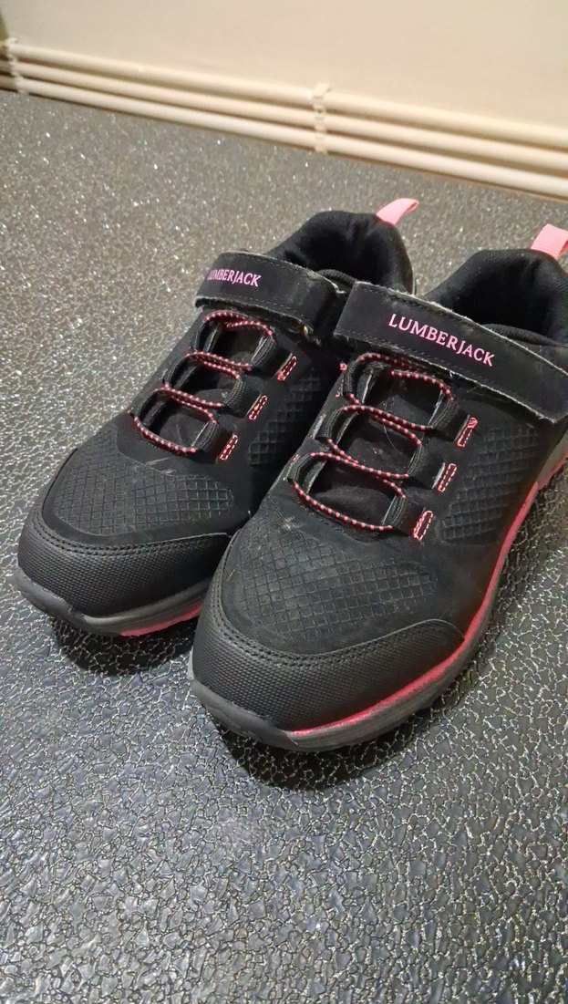 Koyu pembe ve siyah renklerde, baskılı desenli kız çocuk spor ayakkabısı. Velcro kapama ve kauçuk malzemeden üretilmiştir. "LUMBERJACK" markalıdır.