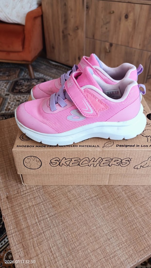 Kız çocuklar için pembe Skechers spor ayakkabı, cırt cırtlı ve kauçuk tabanlıdır. Trendy günlük sokak stili için uygundur. Pastel ve desensiz tasarıma sahiptir.