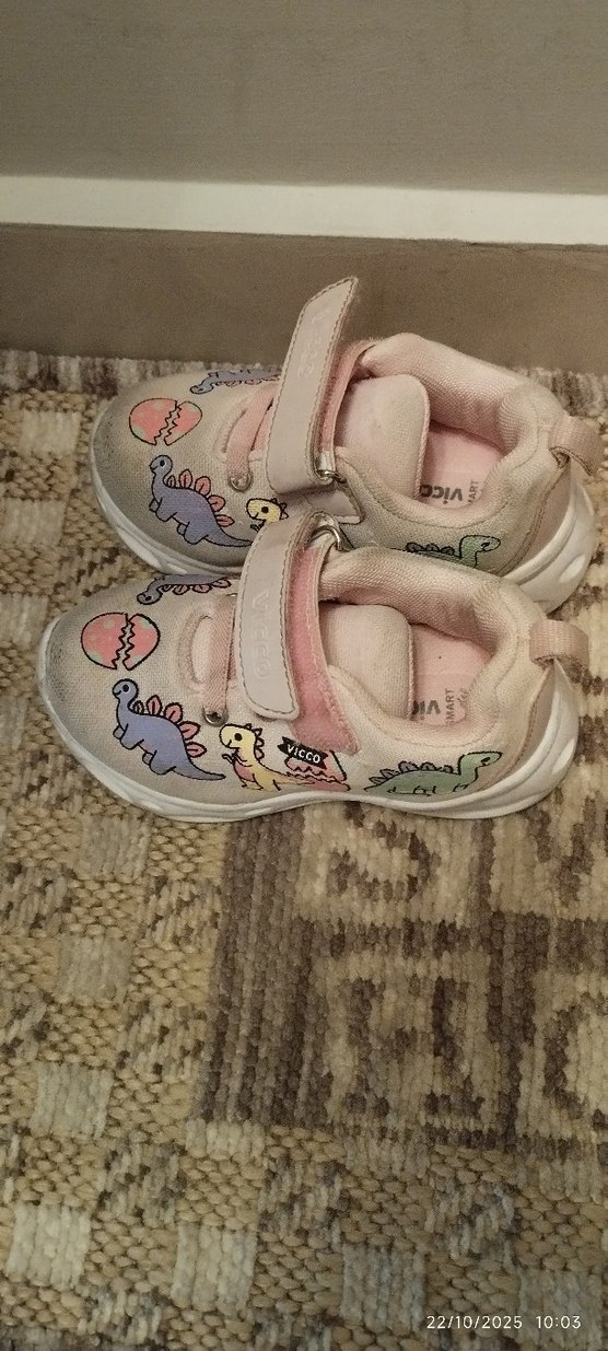 Pembe renkli, pastel dinozor desenli kız çocuk sneaker. Velcro bantlı ve kauçuk tabanlı, sokak modasına uygun rahat ayakkabı yalnız kalıbı dar çok fazla gıyılmedi önünde biraz asınma var