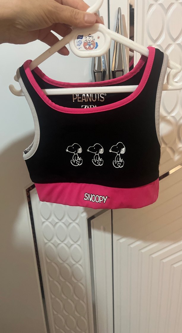 Kız çocukları için pembe, Snoopy baskılı, askısız ve yapışkan bantlı spor atlet. Yumuşak ve sıcak kumaştan üretilmiştir.