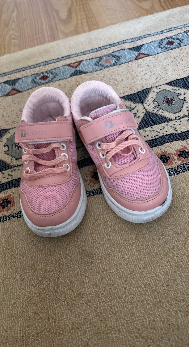 Pembe kız çocuk spor ayakkabısı, velcro bantlı ve kauçuk tabanlıdır. Trendy casual sokak stiline uygundur. Pastel tonlarda ve desensizdir. Son resimde gözüken siyah kısım sorunu vardır onun dışında herhangi bir kusuru yoktur