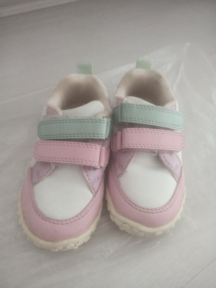 Pastel pembe renkli kız çocuk spor ayakkabısı, velcro bantlı ve kauçuk tabanlıdır, sade sokak stili için uygundur.