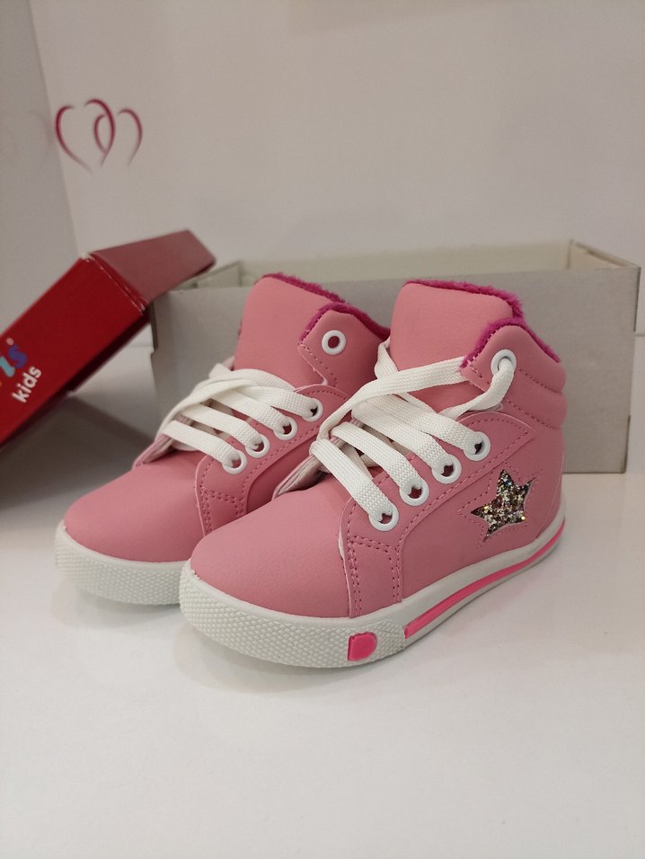 Pembe renkli, lastik tabanlı kız çocuk spor ayakkabısı. Renkli baskılı desen ve kolay kullanım için Velcro kapama içerir. Trend sokak stili için uygun.