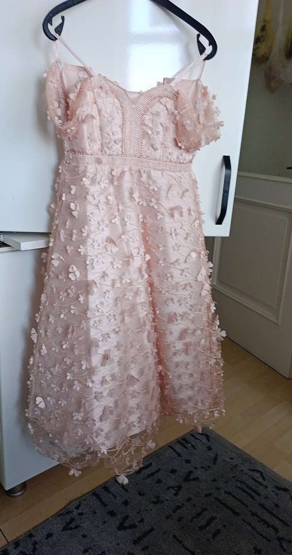 Pembe renkli straplez kız çocuk elbisesi, dantel detaylı ve nakışlı desenlere sahip, yumuşak sentetik kumaştan üretilmiş, vücuda oturan kesim.