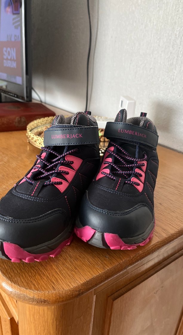 Kız çocukları için koyu pembe ve siyah baskılı, Velcro kapamalı dayanıklı kauçuk botlar. 'LUMBERJACK' yazılı bant ve iç kısımda 'RIACT' detayları bulunur. İade değişim yoktur hiç kullanılmadı