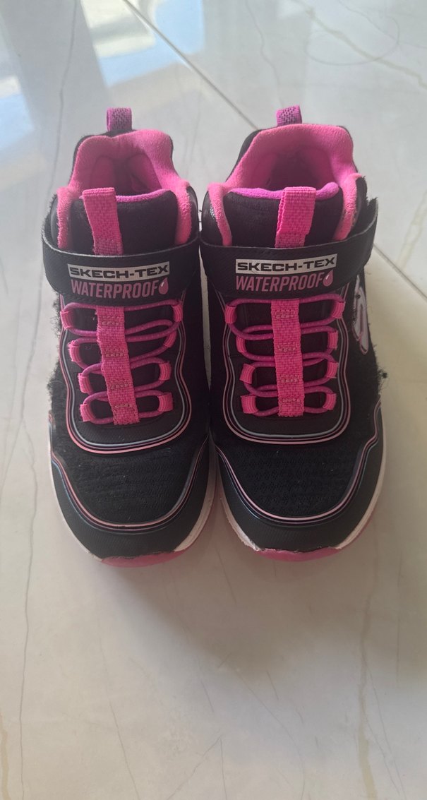 Pembe ve siyah renklerde, su geçirmez malzemeden, cırt cırtlı kız çocuk spor ayakkabısı. Street wear tarzında, renkli ve rock punk havasında, kauçuk tabanlı. Çok ufak bir hasarı bar son görselde görünmektedir