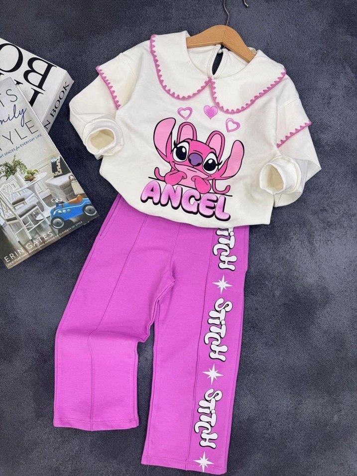 Gevşek kesim kız çocuk pembe baskılı polar sweatshirt, dantel detaylı ve yazılı eşofman altı ile. Yuvarlak yaka ve uzun kollu, rahat kullanım sağlar.