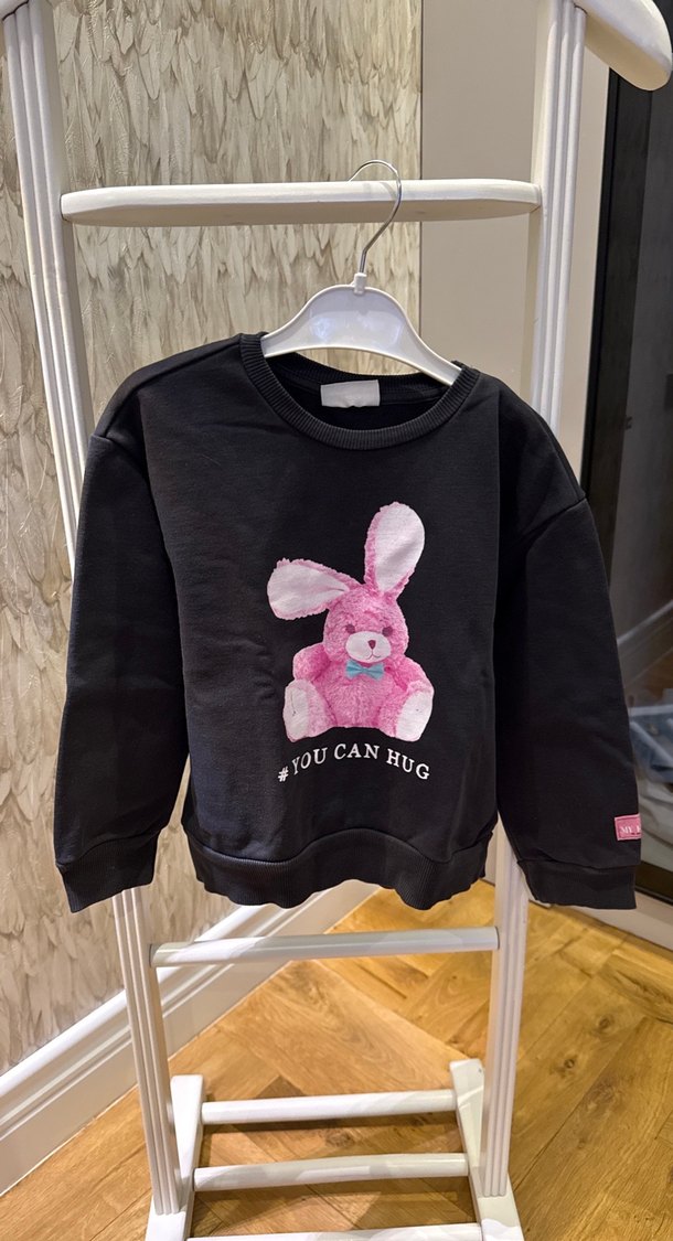 Uzun kollu, bisiklet yaka siyah sweatshirt. Yumuşak ve kalın kumaştan, bol kesim. Pembe örme tavşan baskısı ve 'YOU CAN HUG' yazısı bulunur.