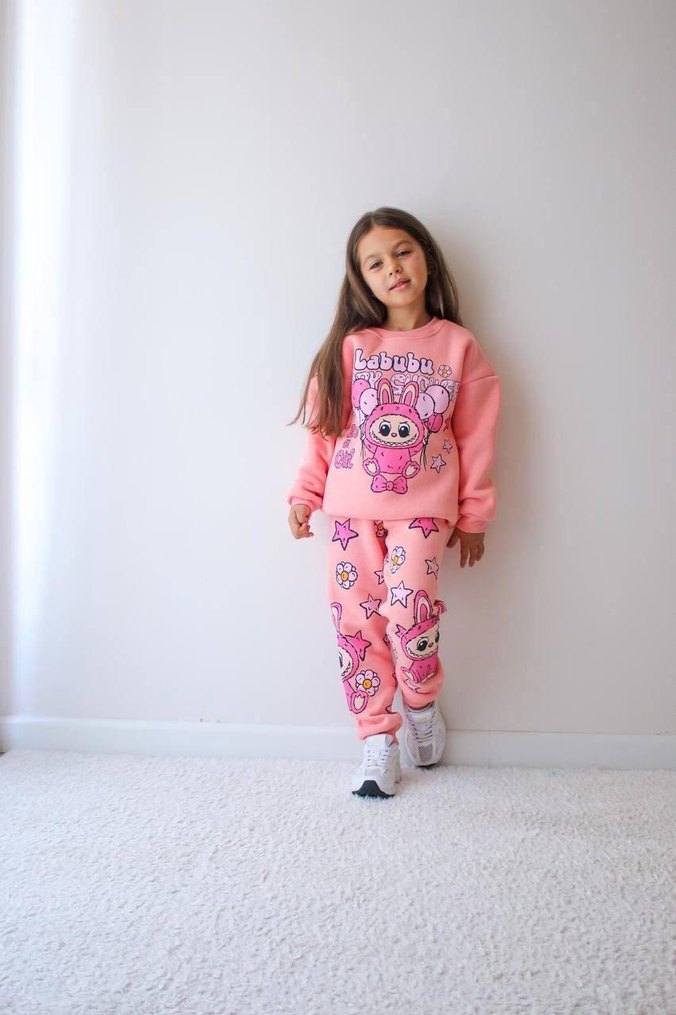 Pembe pastel tonlarda, bol kesim ve tie-dye desenli kız çocuk eşofman takımı. Yumuşak ve sıcak kumaştan, uzun kollu ve puff detaylı, 'Labubu' baskılı.
