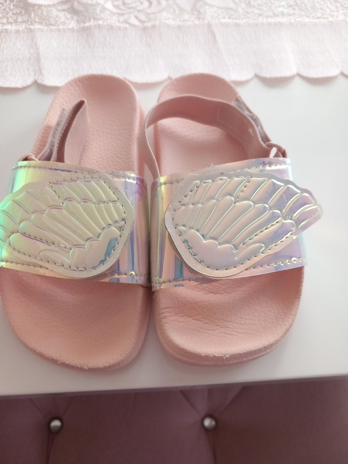 Yumuşak kauçuk malzemeden yapılmış, parlak yüzeyde baskılı kanat desenli, toka detaylı pembe kız çocuk terliği.