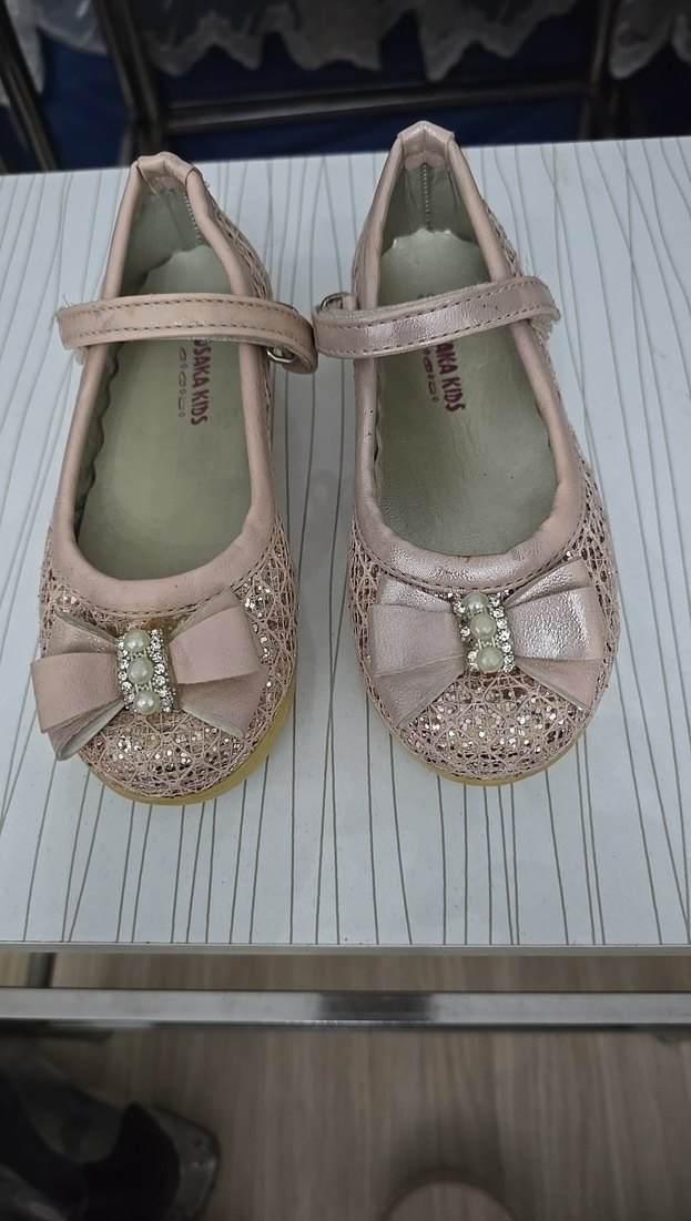 Pembe renkli kız çocuk babetleri, tokalı kayış ve önünde inci detaylı fiyonk ile dikkat çeker. Hafif ve düz yüzeye sahip, kauçuk tabanlıdır. İç kısmında ARAKIDS ve OSAKAKIDS yazılıdır.