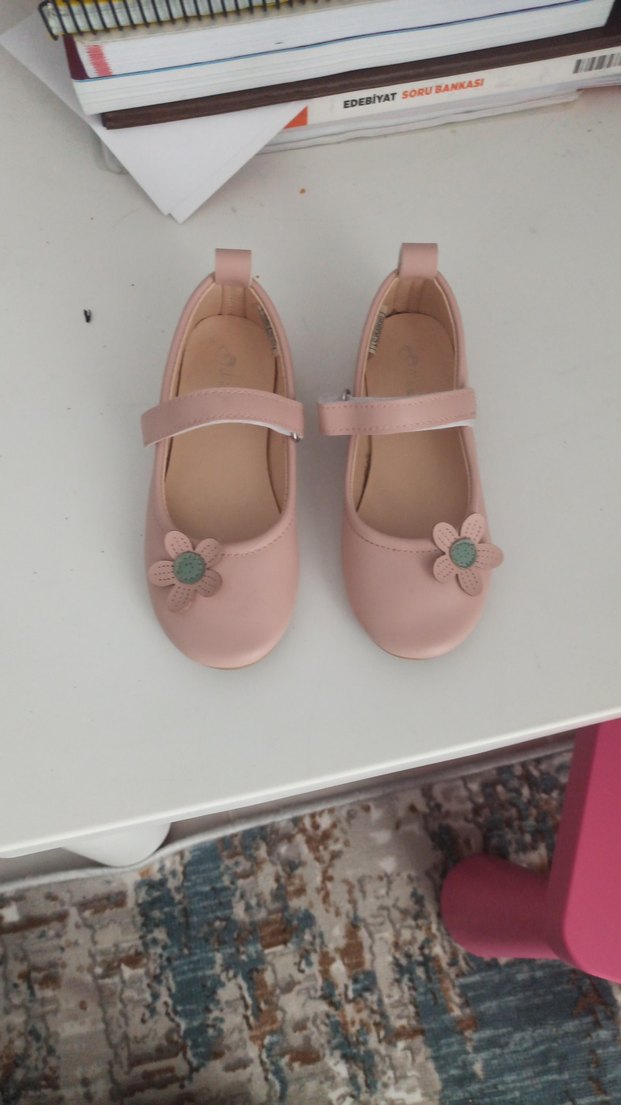 Kız çocukları için tokalı ve çiçek detaylı, yumuşak kauçuk malzemeden yapılmış pembe babetler. Pastel ve çağdaş tasarım.