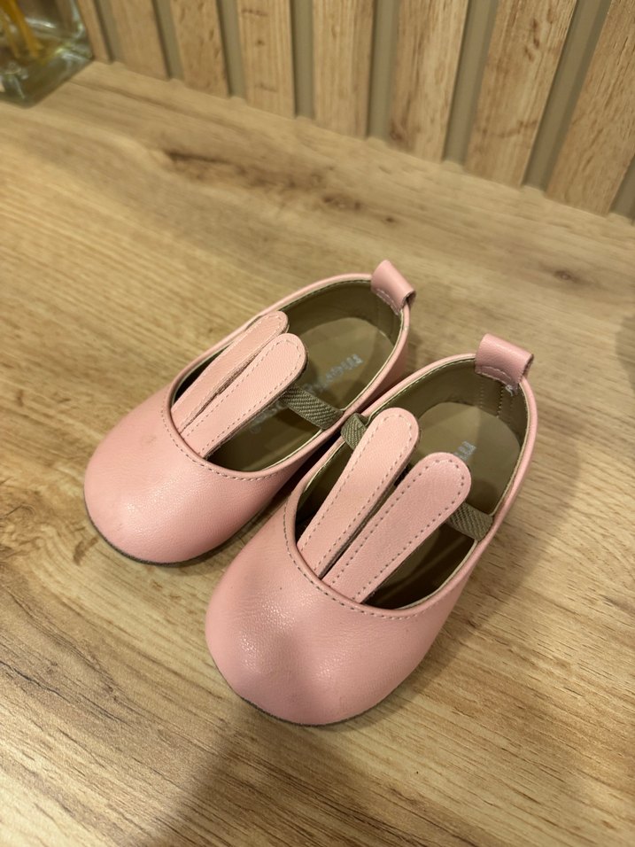 Pastel pembe renkte, tokalı bantlı ve desensiz kız çocuk babet ayakkabısı, yumuşak kauçuk malzemeden üretilmiştir.