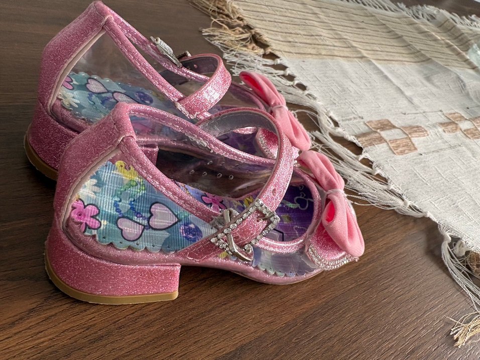 Pembe tokalı kız çocuk özel ayakkabı, renkli nakış detaylı, lastik tabanlı ve düşük topuklu, fiyonk süslemeli.