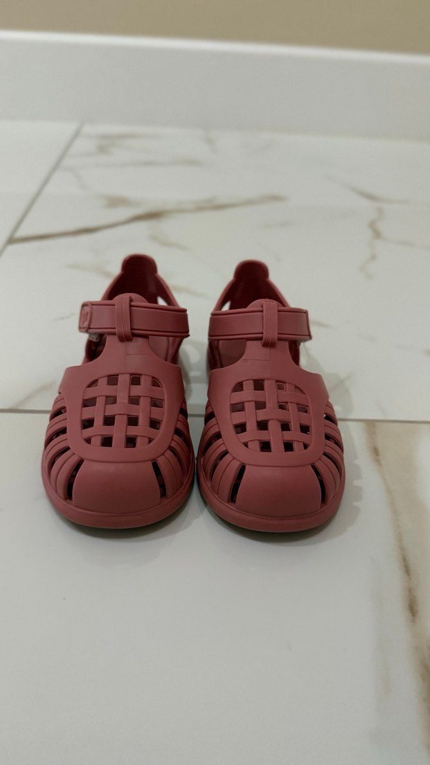 Koyu pembe renkte, kauçuk malzemeden yapılmış kız çocuk sandaletleri. Kızım sadece yazın kullandı. Hiçbir defosu yoktur.