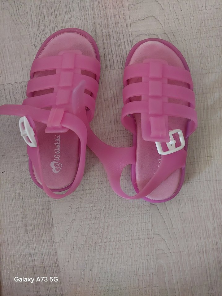 Yumuşak kauçuk malzemeden yapılmış, tokalı, sade ve desensiz pembe kız çocuk sandaletleri.