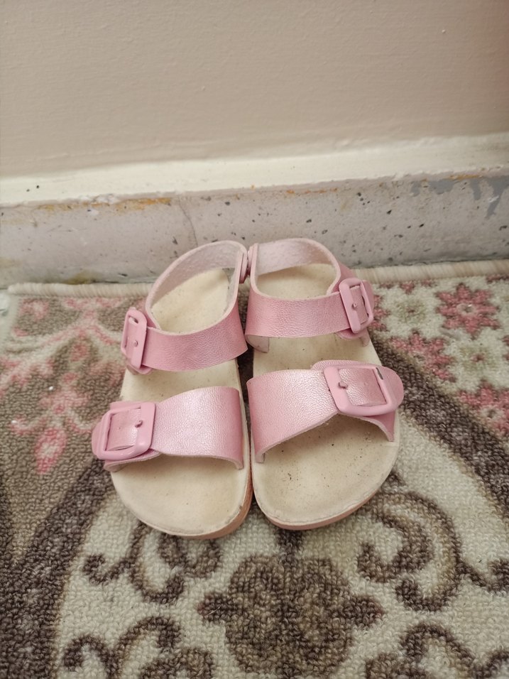 Kız çocukları için pembe pastel renkte, tokalı ayarlanabilir kayışlı kauçuk sandalet. Normcore tarzıyla bohem ve retro görünüme uygun.