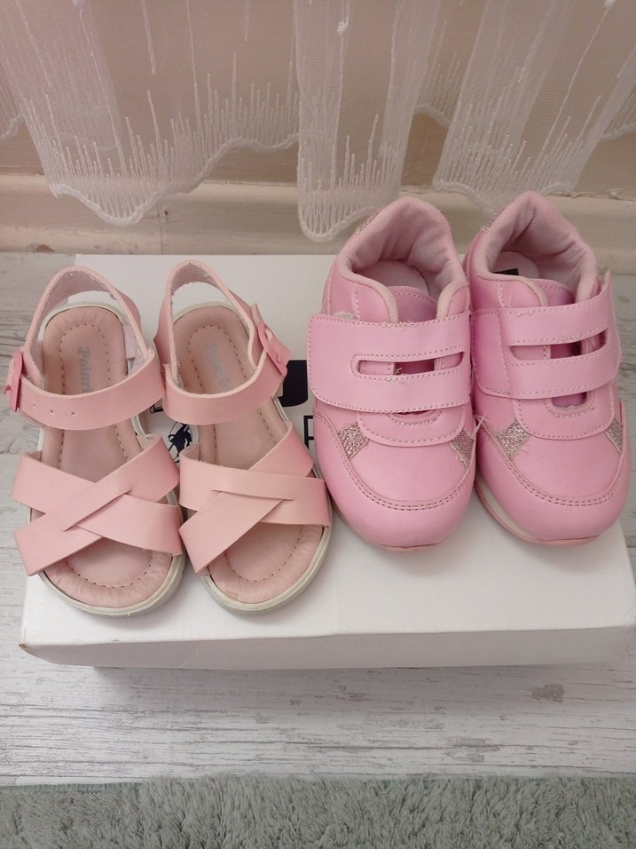 Pastel pembe renkte, kauçuk malzemeden yapılmış kız çocuk terlik ve spor ayakkabı. Terlikler tokalı çapraz bantlı, spor ayakkabılar cırt cırtlıdır. Desensiz ve rahat stil.