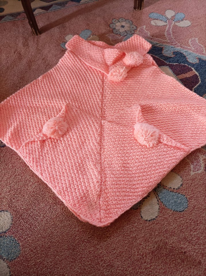Kız çocukları için uzun kollu, boğazlı, bol kesim triko panço. Pastel pembe renkte, düz ve ponpon detaylıdır.