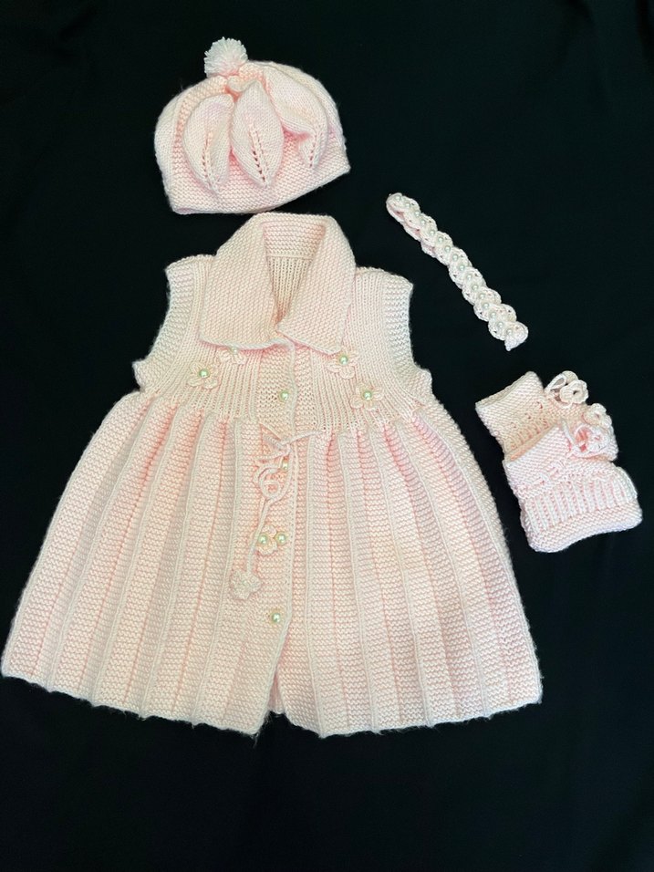 Kız çocukları için işlemeli detaylara sahip, regular fit, pembe triko kolsuz elbise takımı. Yumuşak triko şapka, saç bandı ve patik içerir. Rengi pudra pembesidir