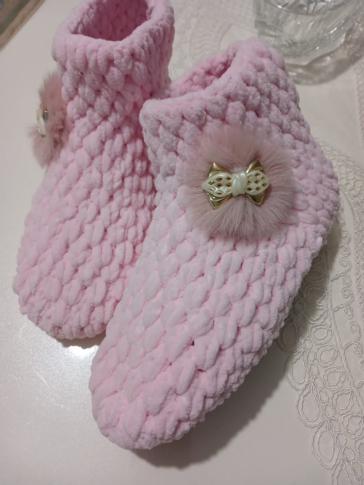 Kız çocukları için pembe renkli, yumuşak trikodan örülmüş, fiyonk ve tüylü süslemeli sıcak ev botu.