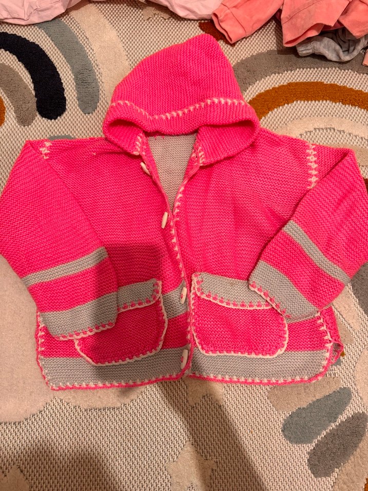 Tertemiz 4 5 yaş uyumlu kesim, bohem tarzda kız çocuk triko hırka, pembe ve gri nakışlı detaylarla. Askılı kollu ve düğmeli kapüşonlu.