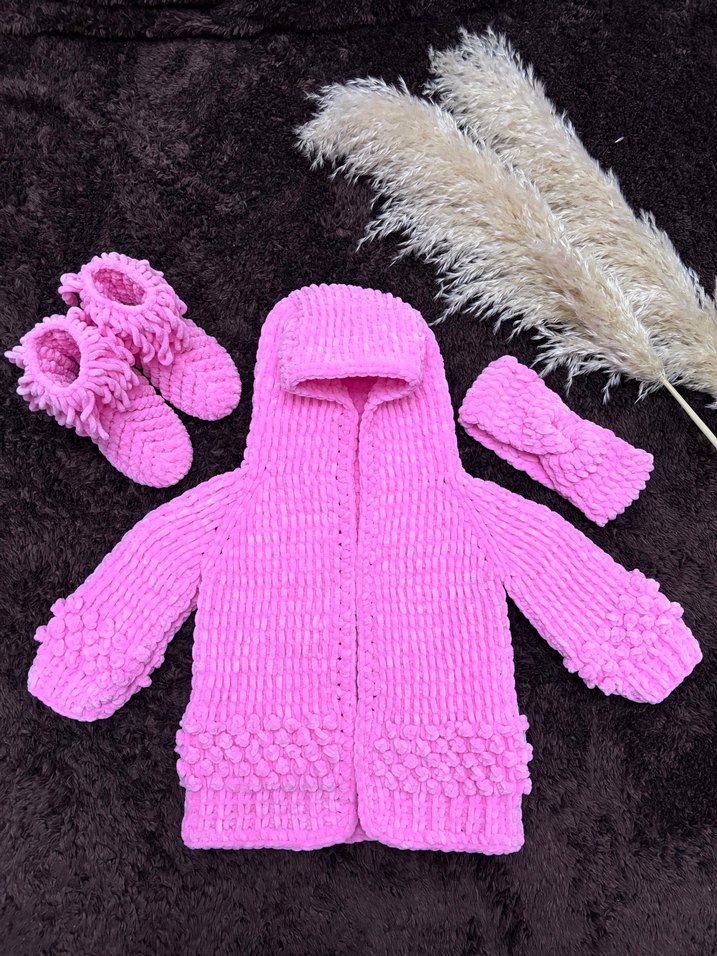 Renkli pembe triko kız çocuk hırka seti, kapüşonlu, bol kesim, uzun kollu, uyumlu patik ve saç bandı ile.
