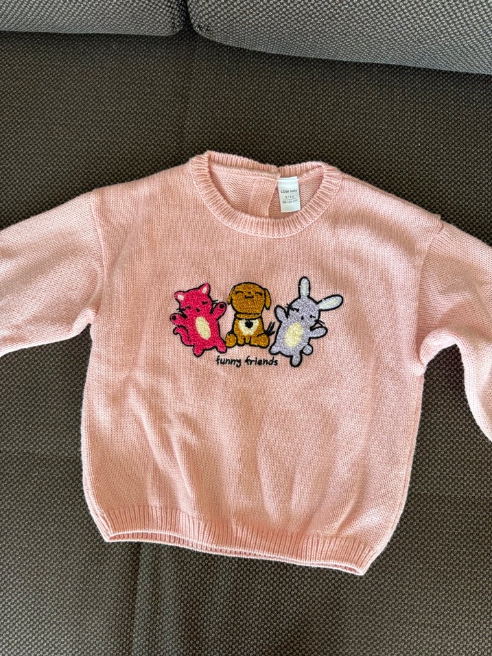 Uzun kollu, bisiklet yaka, pembe triko kız çocuk kazak, Önde 'funny friends' yazılı üç sevimli hayvan baskısı bulunur. Rahat kesim. Tertemiz, 3-4 yaş