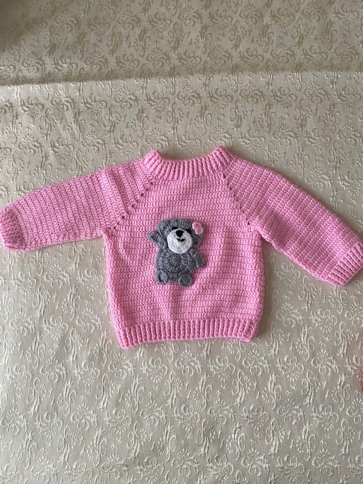 Pembe, uzun kollu, yuvarlak yaka, bol kesim kız çocuk triko kazak. Önde gri renkli nakışlı ayıcık detayı bulunur.