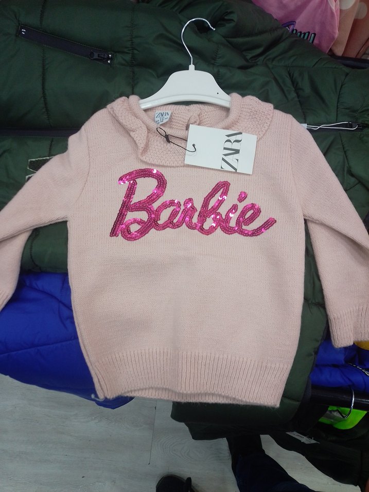 Kız çocukları için pembe, fitted kesim triko sweatshirt. Uzun kollu, bisiklet yaka ve renkli "Barbie" baskılıdır. Trend sokak giyimine uygundur. 6 yaş
