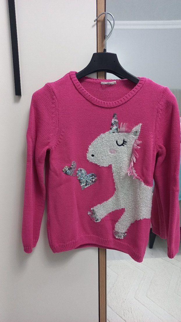 Pembe renkli, triko kumaştan yapılmış, uzun kollu ve bisiklet yaka kız çocuk kazak Üzerinde parlak detaylı renkli unicorn baskısı bulunur.