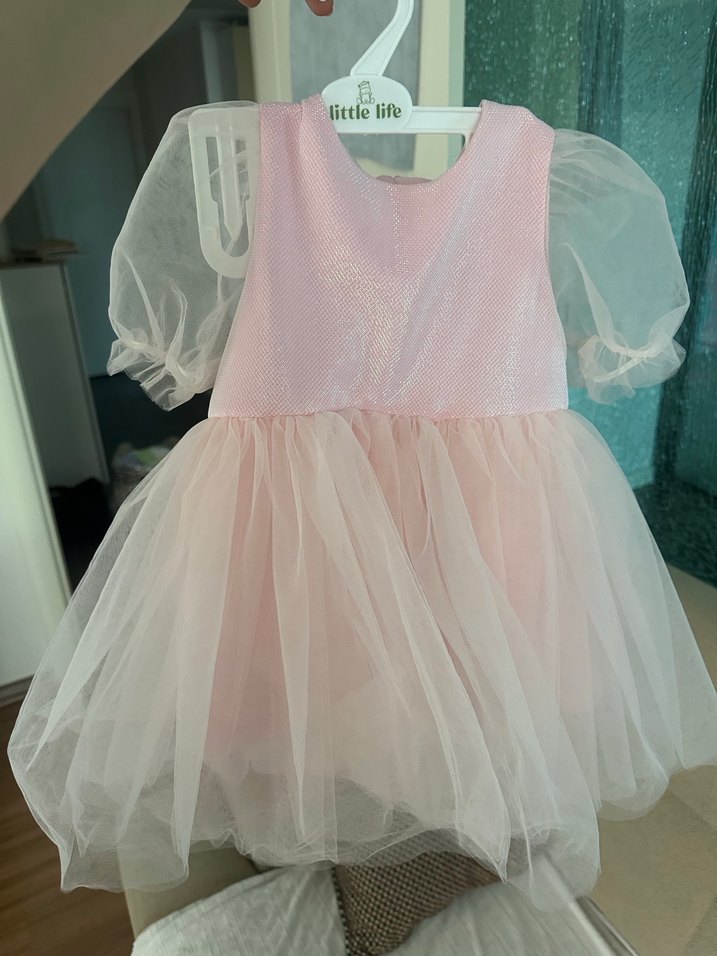 Kolsuz, volan detaylı, bol kesim pembe elbise. Pastel tonlarda ve straplez yakalıdır. Little Life markasına aittir. 2 yaş. Kızım sadece 1 kaç saat giydi. Tertemiz. 2 yaş için uygundur.