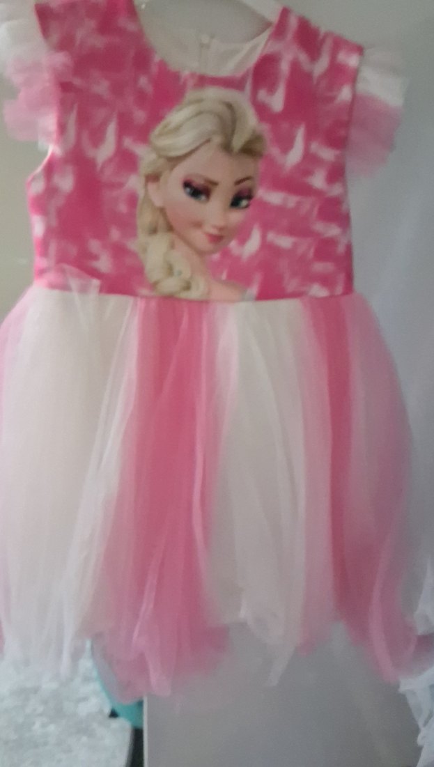 Pembe renkli, baskılı karakterli, askısız ve kolsuz, oturan kesim elbise. Tül detaylı volanlı etek kısmı ile pop kültür tarzını yansıtır.
