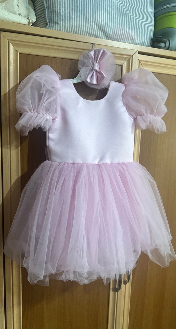 Kız çocukları için pembe, kısa kabarık kollu, tüllü etekli ve ruffle detaylı, yumuşak sentetik kumaştan yapılmış elbise. Saç aksesuarı ile birlikte. Sadece yaş gününde giyildi bir kere önünde hafif. Gözü gözükmeyecek şekilde leke var yikayinca çıkacak